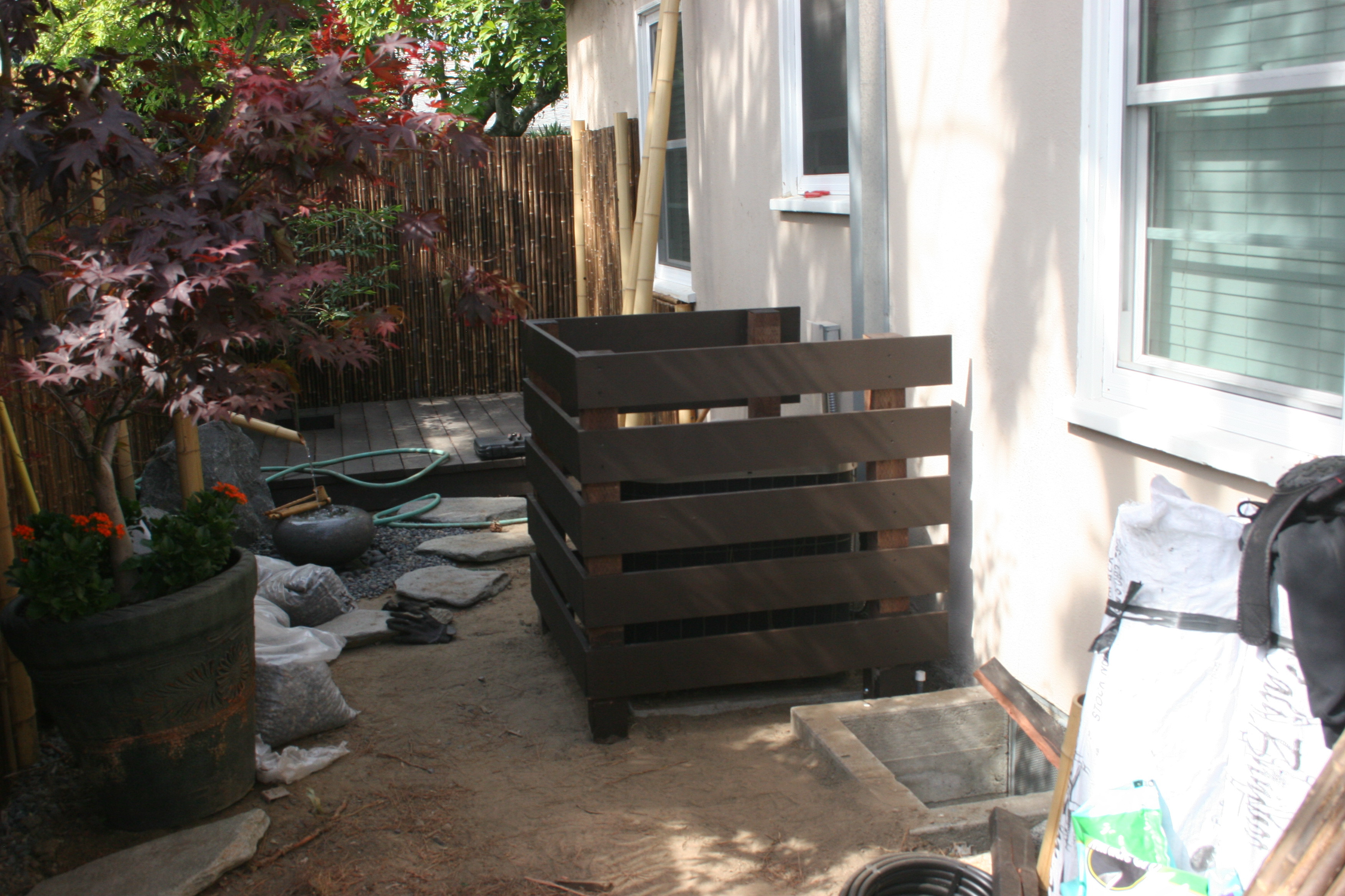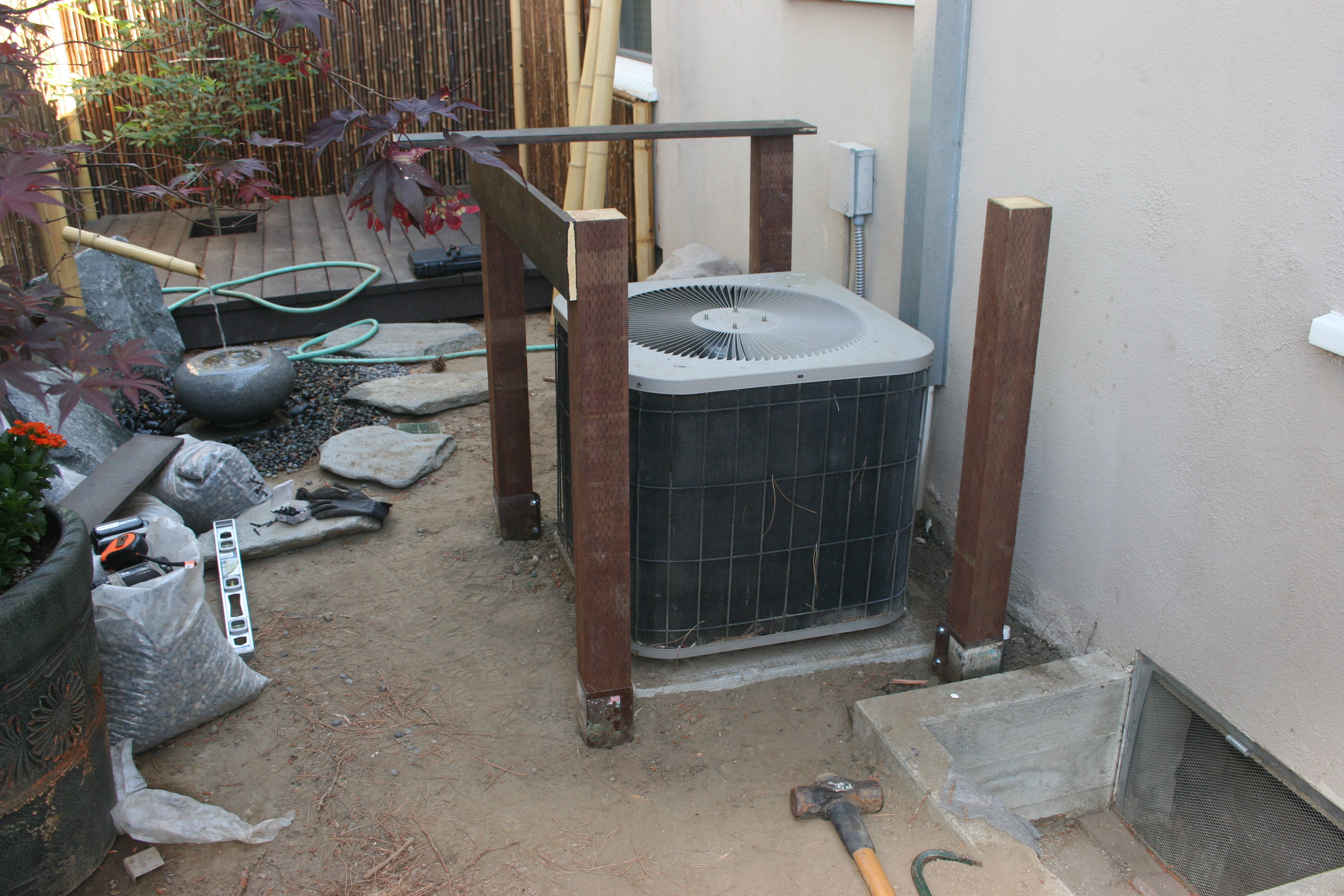 With that being my course of action, the next stage of my garden is unfortunately partially occupied by my HVAC unit (Air conditioning Condenser.) While I won’t complain about having an air conditioner, especially after the mid 90 degree temperatures this past weekend, the unit is really an eyesore and pretty difficult to disguise for a few reasons. The unit is fairly large and sits from the house wall to about 1/3 of the way into the middle of the garden. The other issue is its intended use, which is to create air flow into the unit, and home which requires the unit to be clear and fee of debris or anything else that might obstruct consistent access to air.